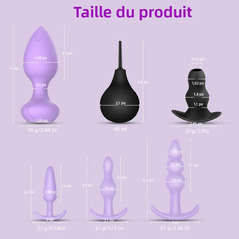 Ce coffret complet comprend 6 accessoires essentiels : un plug anal vibrant avec télécommande, trois plugs anaux en silicone de tailles variées, un plug dilatateur creux et une poire anale. Idéal pour les débutants comme pour les utilisateurs expérimentés, ce set répond à toutes les envies de jeu anal, en solo ou à deux.